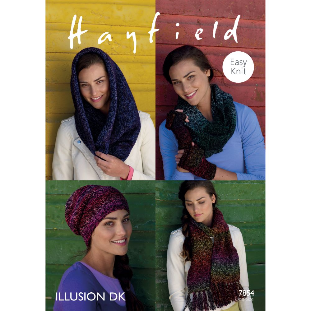 S7854 Scarf, Snoods, Hat and Fingerless Mittens for Women in Hayfield Illusion DK